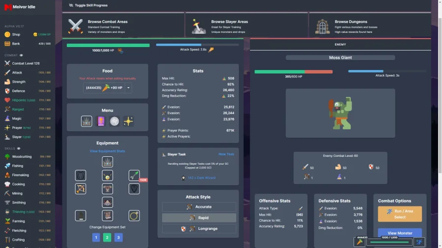 Melvor Idle — это как отпуск, только вместо пляжа — бескрайние поля приключений и море опасностей. Вы в роли храброго героя, которому не чужды риск и острый меч. Вместо скучных тренировок — два десятка навыков, каждый из которых открывает для вас новые горизонты развития. Хочешь ковать броню или закручивать магические заклинания? Здесь любые мечты становятся реальностью с парой кликов. Только не забывай: каждый навык — это отдельная история, и недооценивать их влияние глупо. Мир Melvor живет своей тайной жизнью — здесь за каждым кустом прячется загадка, а в подземельях шепчут мрачные легенды. Монстры? Их не просто много, а очень много — и все они мечтают стереть вас в пыль. Будь начеку: совершенствуй свой арсенал, потому что враги не дремлют и всегда готовы показать, кто тут главнее. Система заданий работает не хуже будильника — постоянно подталкивает вперед и награждает за успехи. В Melvor Idle нельзя расслабляться, но зато здесь никогда не бывает скучно. Лично мне всегда нравилось, что игра не заставляет торопиться — можно развиваться в своем ритме. И кто знает, может, именно ты станешь легендой, о которой будут слагать песни?